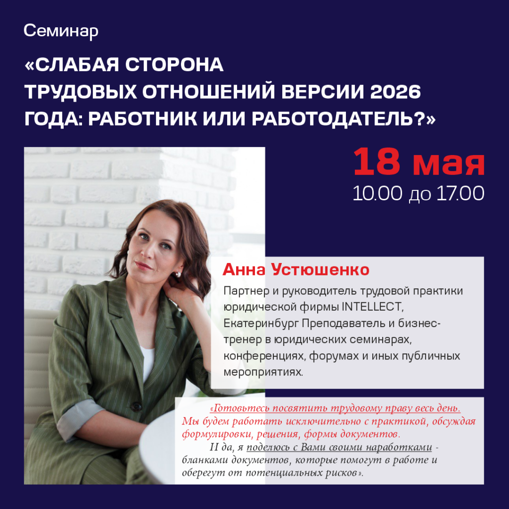 Приглашаем на семинар, который поможет разобраться в актуальных рисках трудовых отношений 2026 года, включая злоупотребления правами работников и ошибки работодателей при увольнениях, премиях и дисциплинарке. 💡 Почему стоит прийти? На семинаре вы разберёте самые острые вопросы трудовых отношений, которые беспокоят работодателей и работников. Вас ждёт глубокая практическая проработка тем с экспертом высшего уровня! ❓ Кому будет полезен семинар: